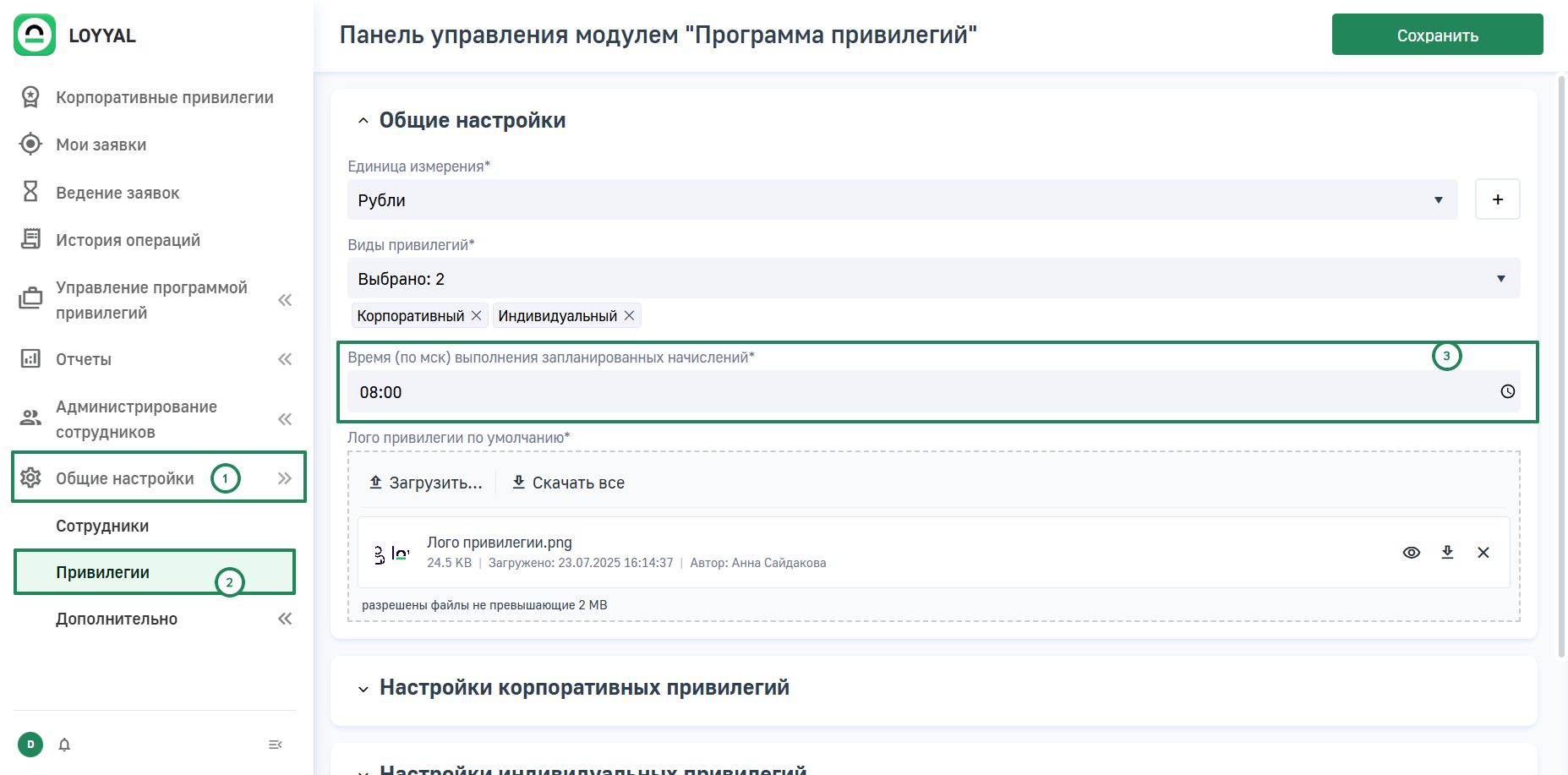 Вы можете изменить время выполнения начислений, для этого перейдите на вкладку меню Общие настройки -> Привилегии и введите нужное время по московскому часовому поясу.