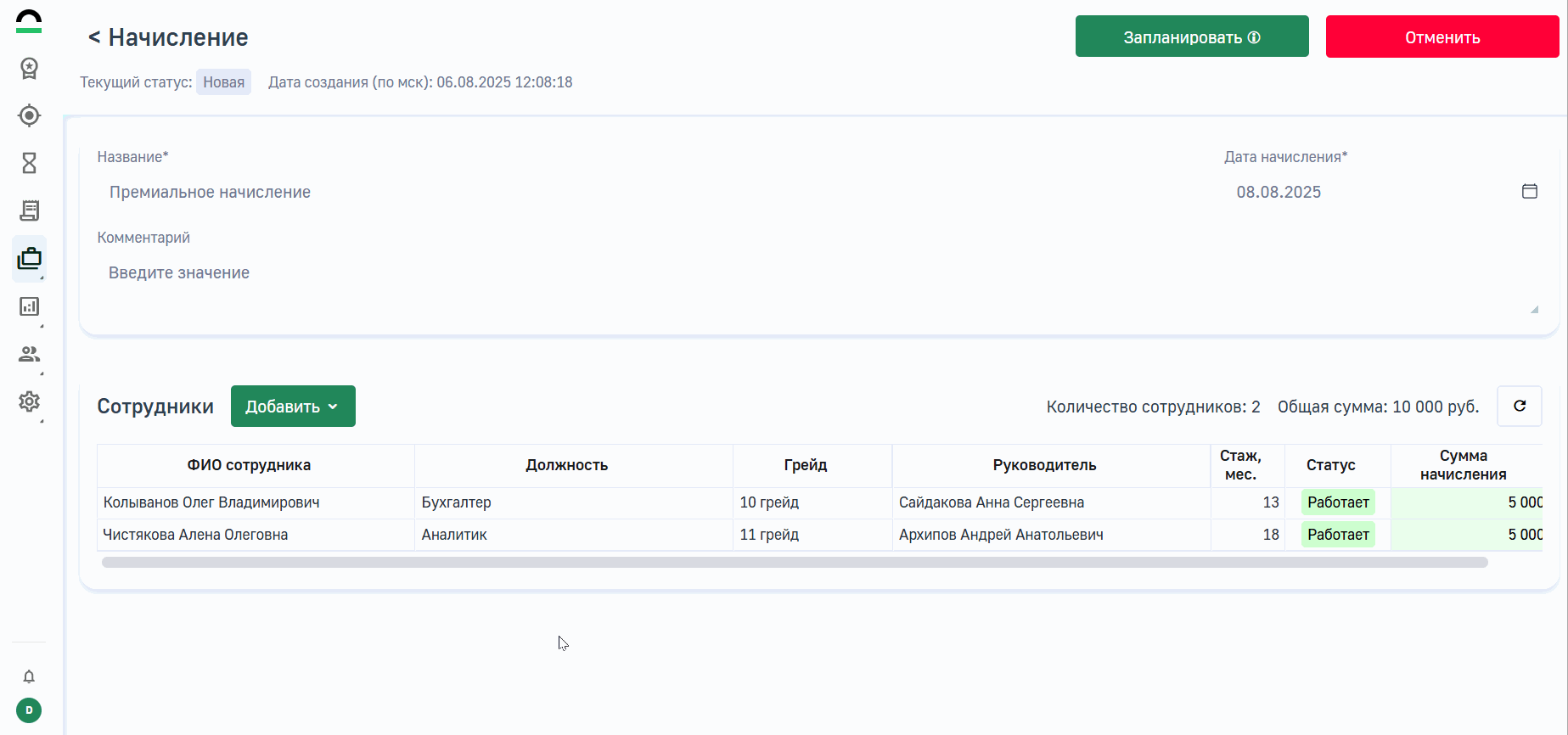 Если же датой начисления выбрана будущая дата, то вы увидите кнопку Запланировать, после нажатия на которую начисление будет запланировано на выбранную дату. В этом случае заявка получит статус Запланирована.