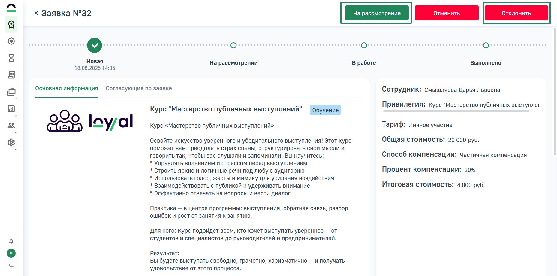 Первичная обработка заявки осуществляется сотрудниками групп доступа HR и Главный HR