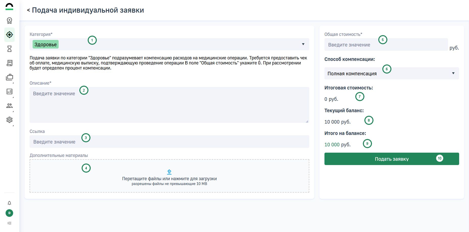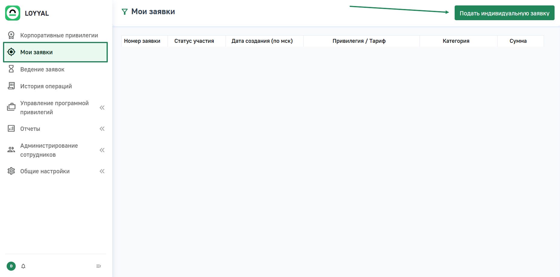 Перейдя на вкладку меню Мои заявки, вы можете увидеть список всех своих заявок и подать новую, для этого нажмите на кнопку Подать индивидуальную заявку.