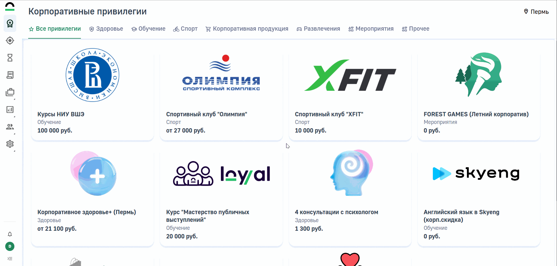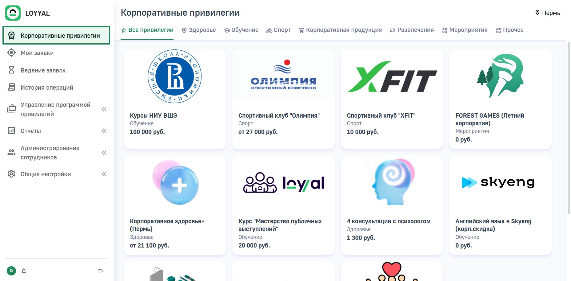 Посмотреть доступные корпоративные привилегии можно на вкладке меню Корпоративные привилегии.