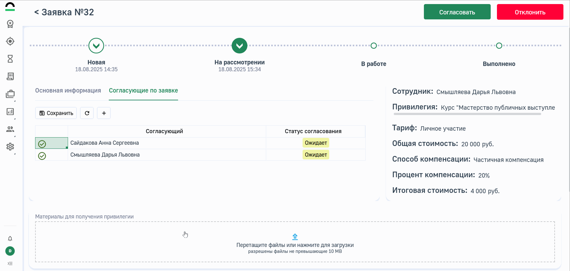 На шаге рассмотрения заявки вы можете корректировать согласующих в рамках отдельной выбранной заявки.