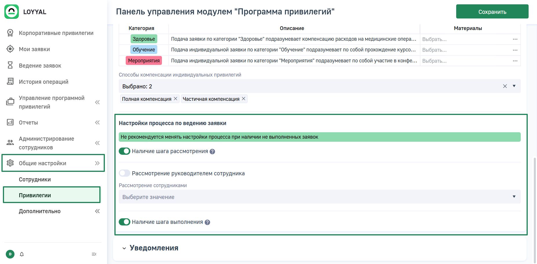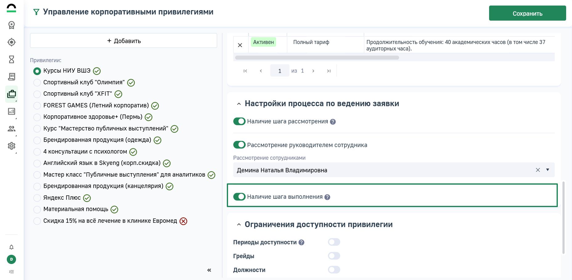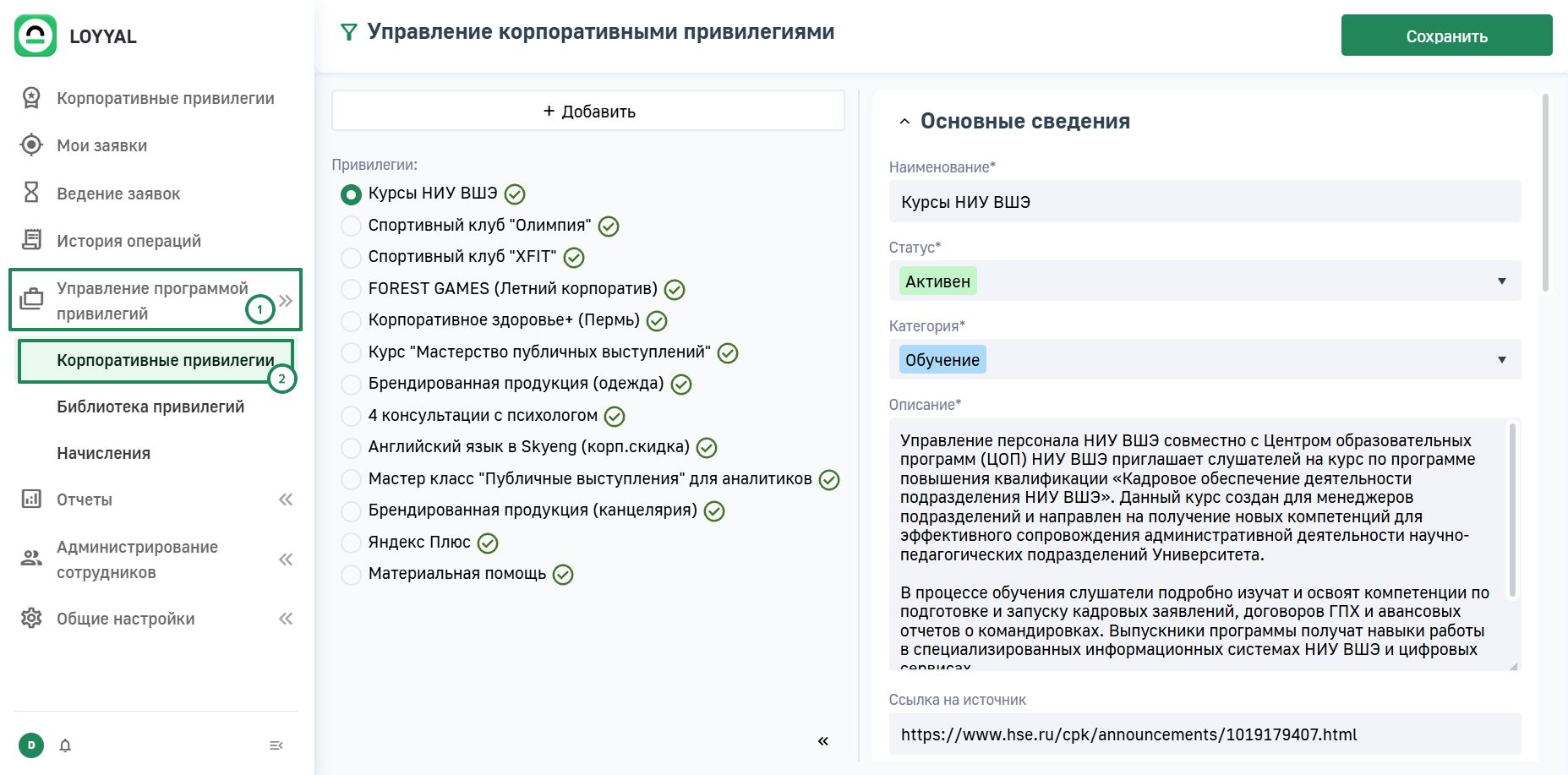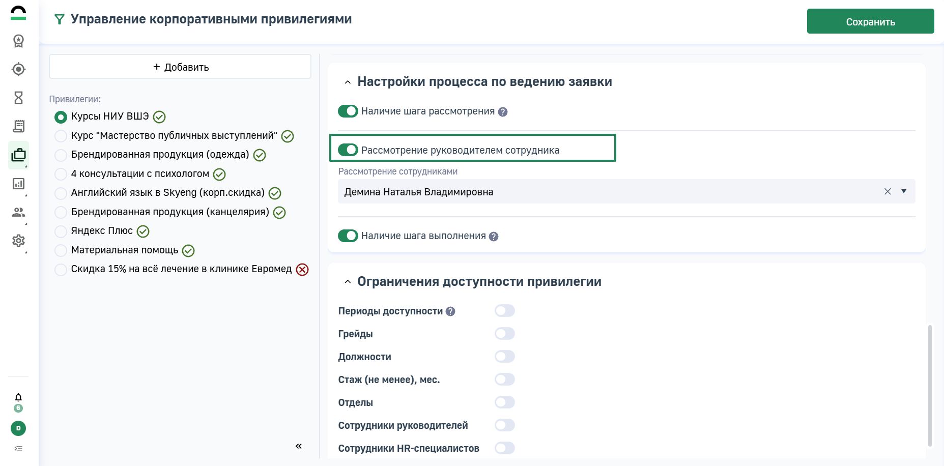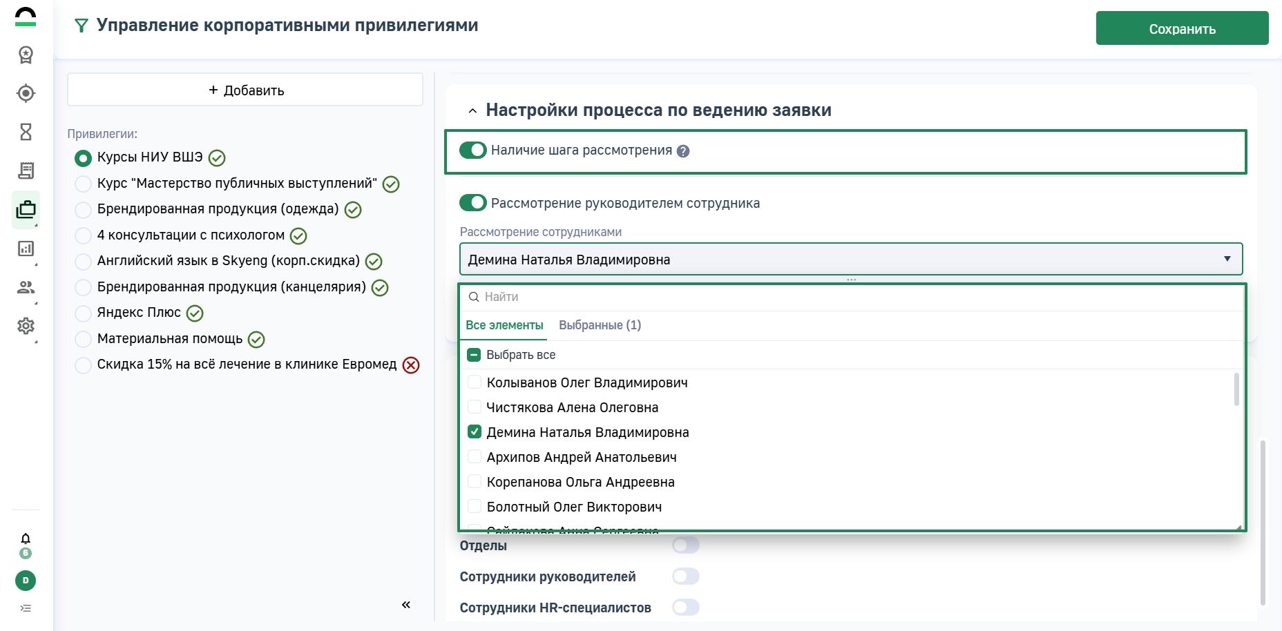 Настройка процесса ведения заявок на получение корпоративных привилегий доступна сотрудникам группы доступа HR и Главный HR