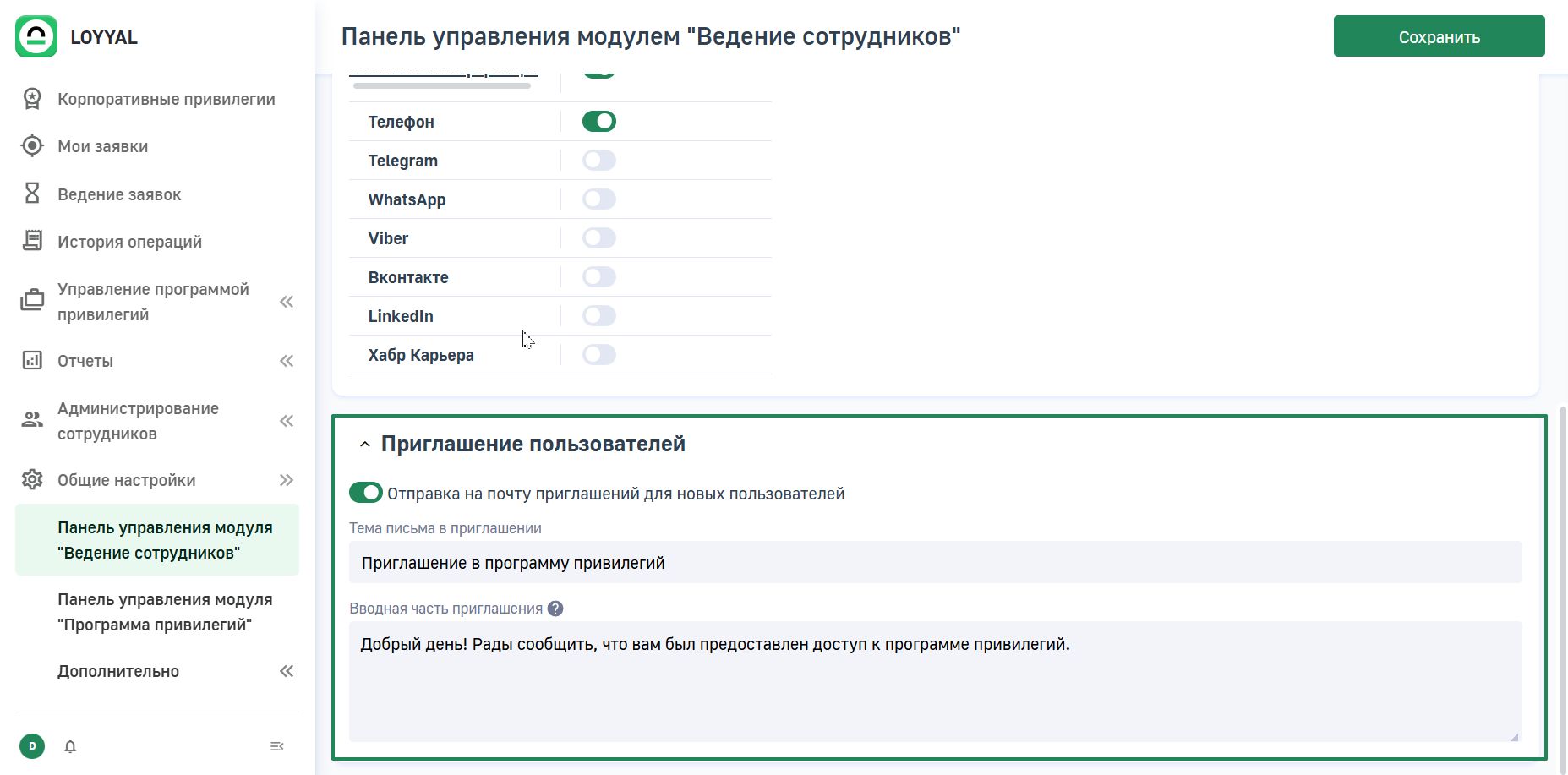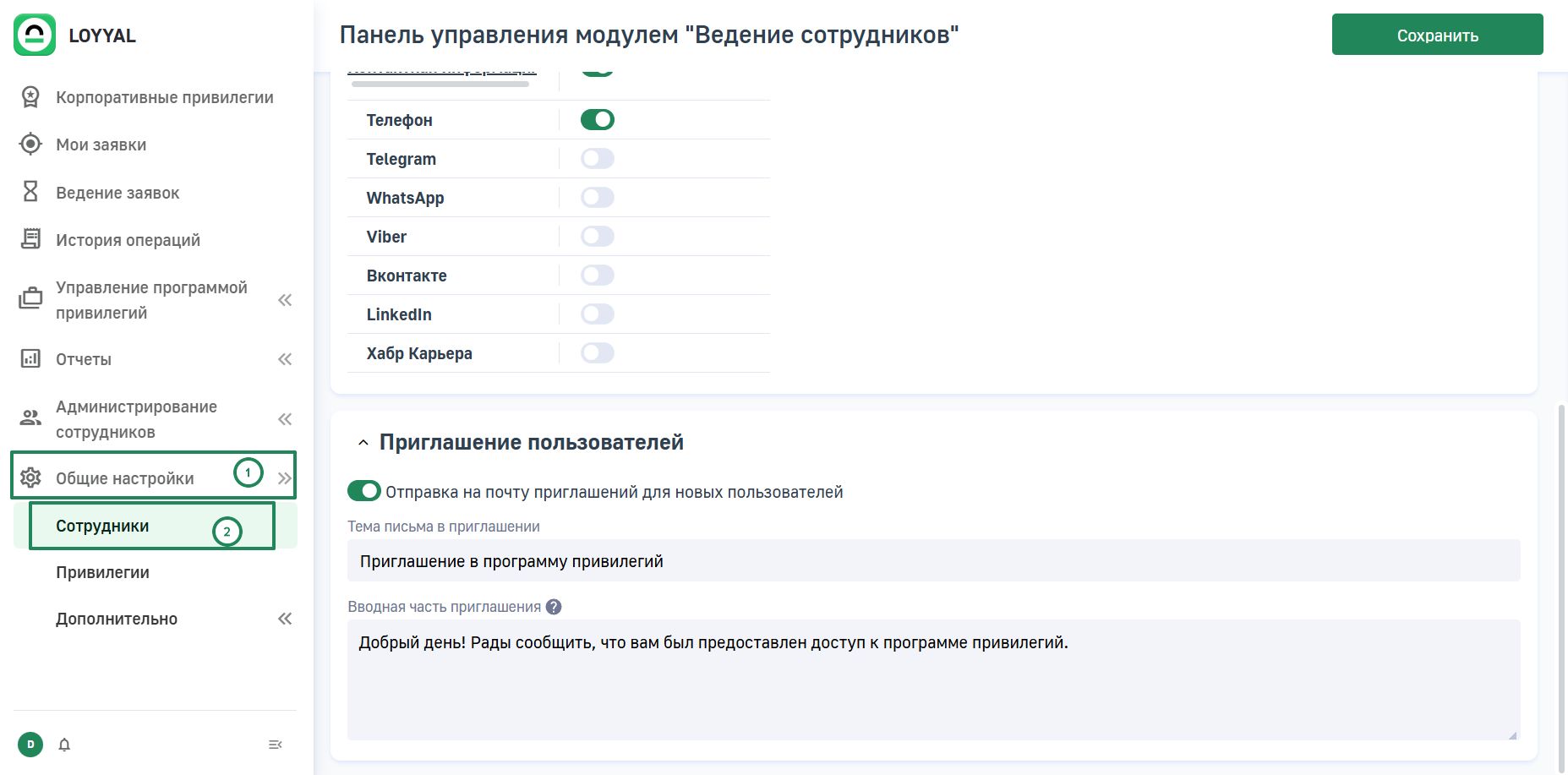В программе лояльности LOYYAL может быть включена возможность рассылки приглашений сотрудникам на почту сразу после добавления их в список участников.