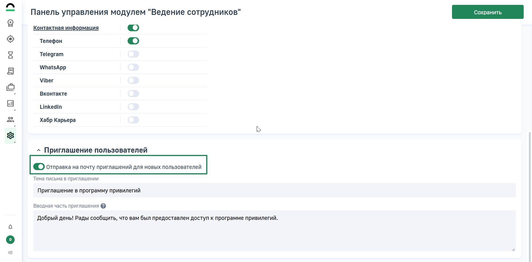 Для использования автоматической отправки приглашений на почту сотрудникам проверьте, включена ли возможность отправки приглашений на почту в настройках.