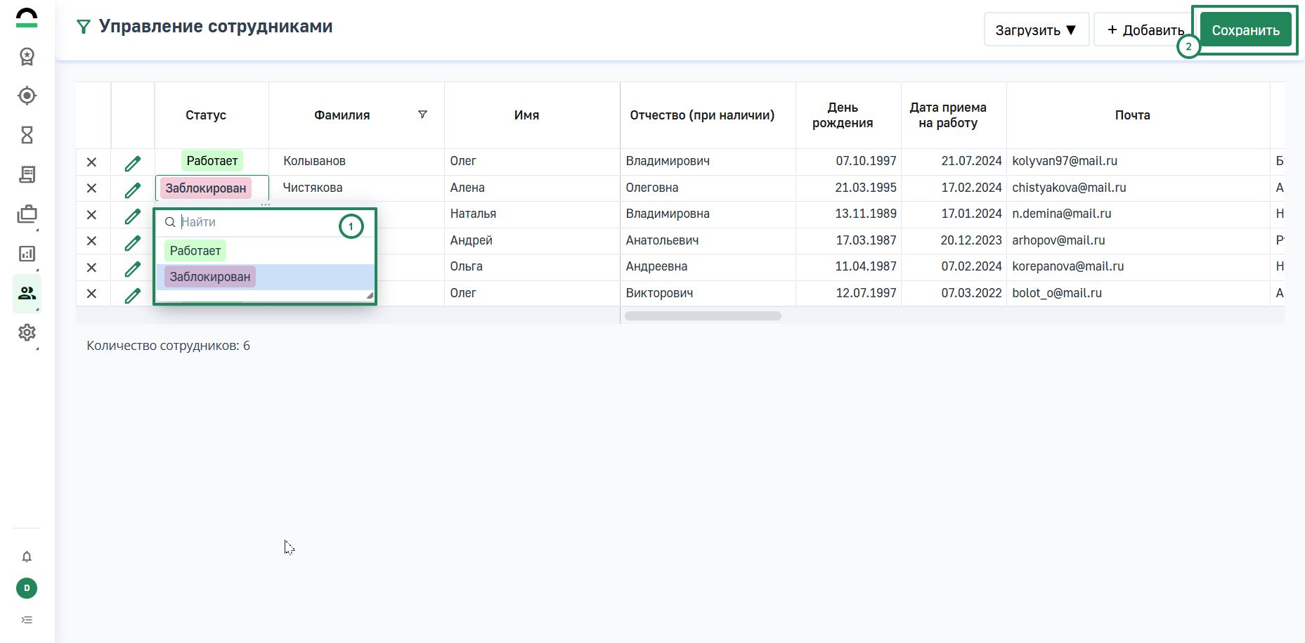 Сотрудникам с группой доступа HR доступна блокировка сотрудников, у которых они указаны в качестве HR