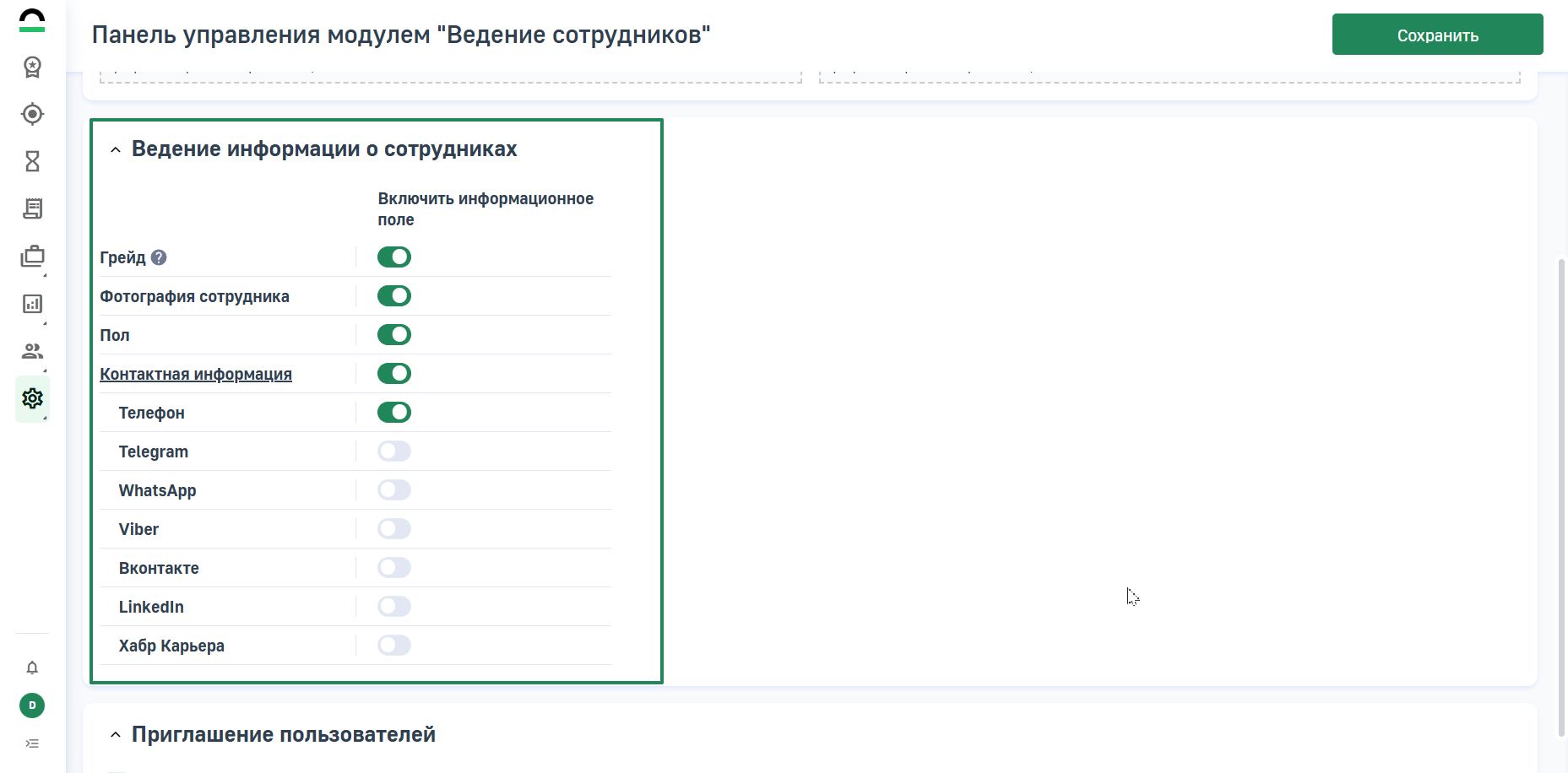 В блоке Ведение информации о сотрудниках выберите необходимое вам дополнительное информационное поле и переведите переключатель в состояние Включен.
