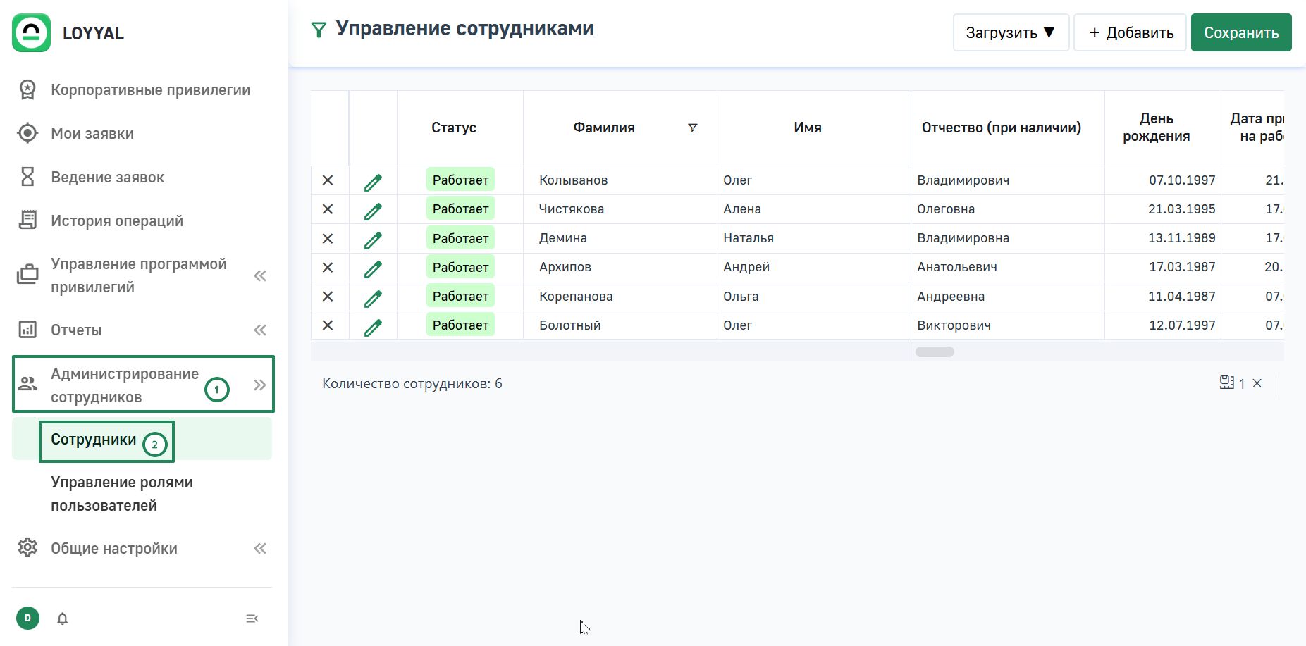 Для работы со списком сотрудников в меню перейдите на вкладку Администрирование сотрудников -> Сотрудники.