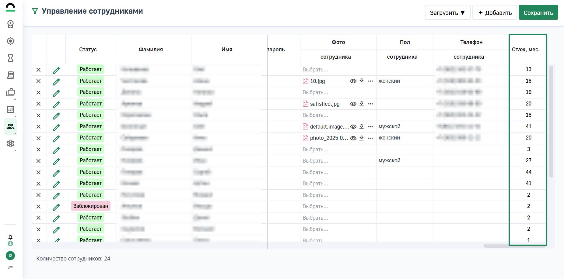Для сотрудников в таблице автоматически считается стаж работы (мес.).