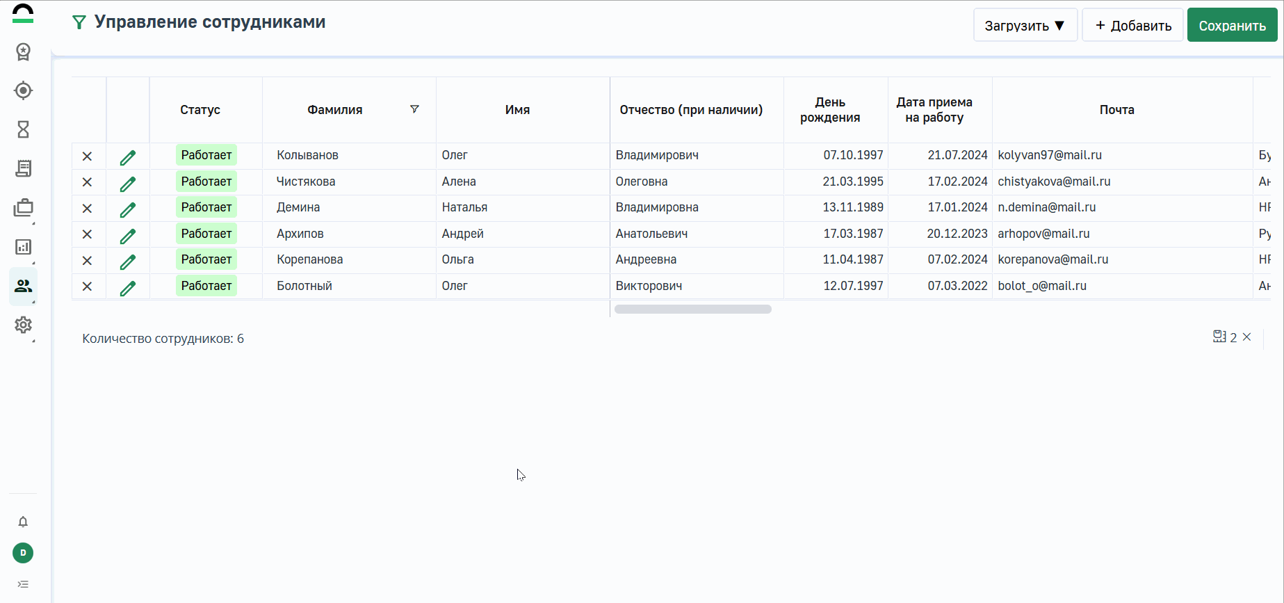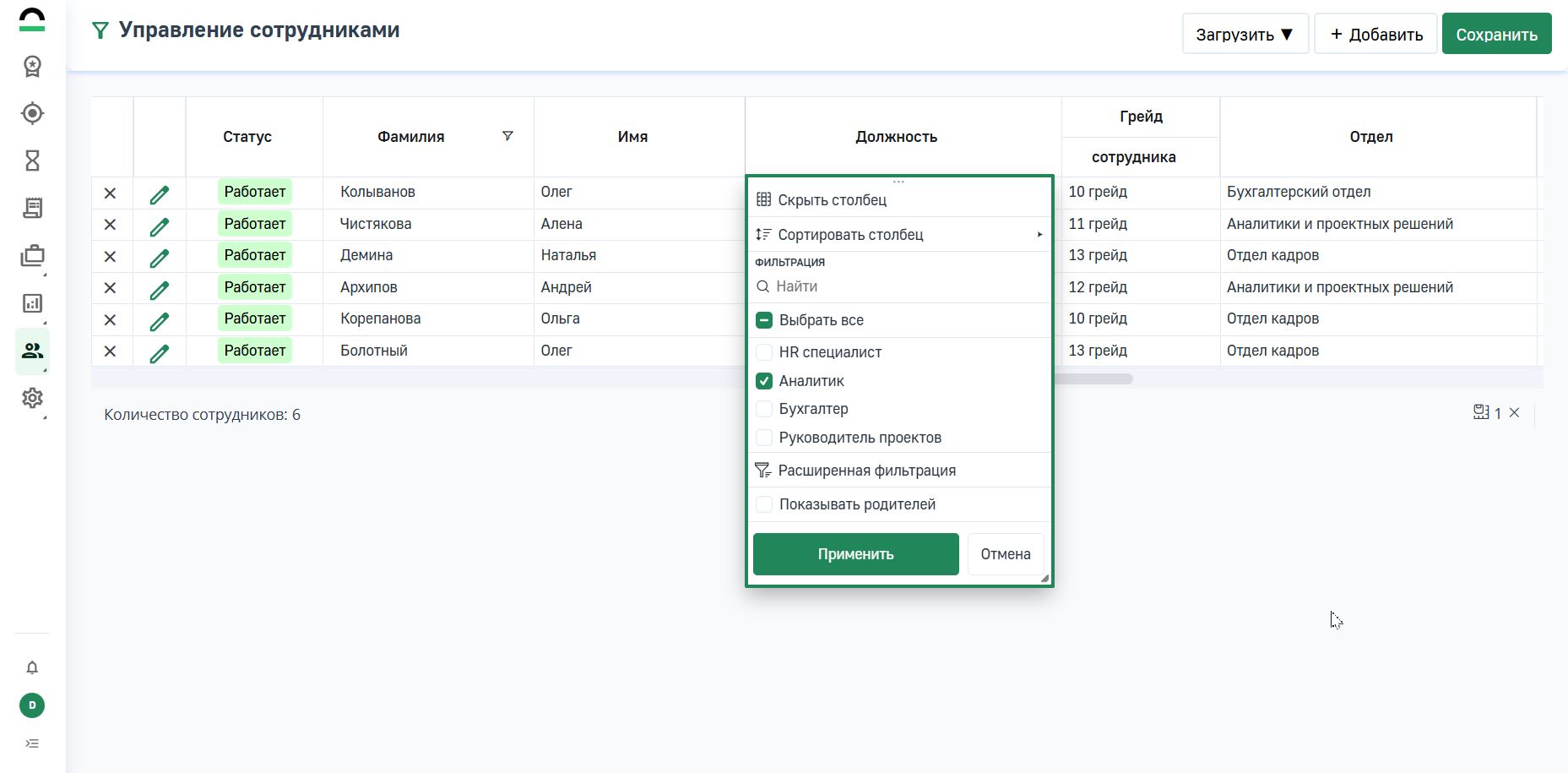 Чтобы облегчить просмотр и анализ информации, вы можете фильтровать или сортировать сотрудников непосредственно по содержимому любого столбца.