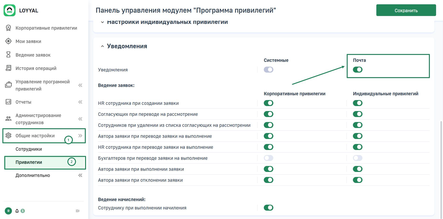 Для использования автоматической отправки уведомлений на почту сотрудникам проверьте, включена ли возможность отправки уведомлений на почту в настройках.