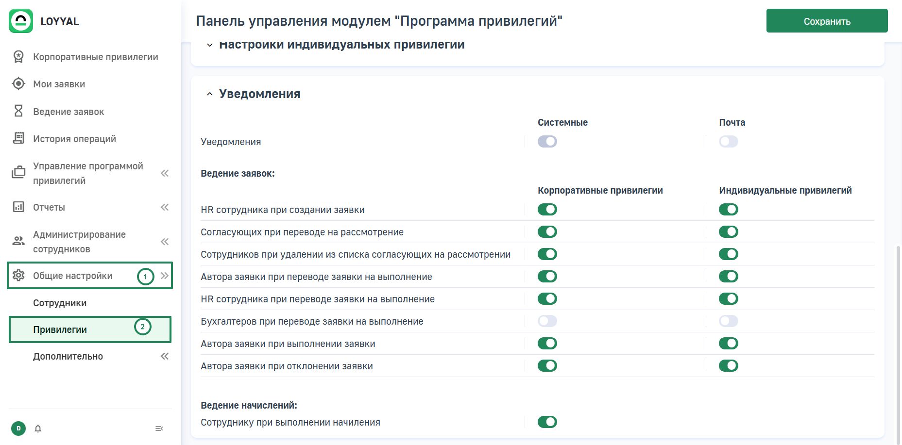 Для настройки уведомлений перейдите на вкладку меню Общие настройки -> Привилегии.