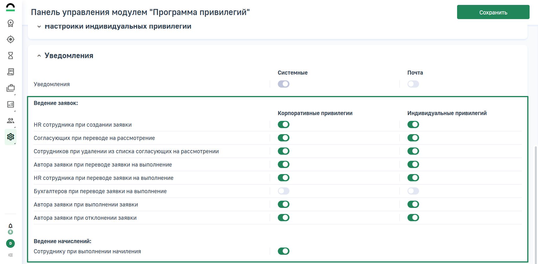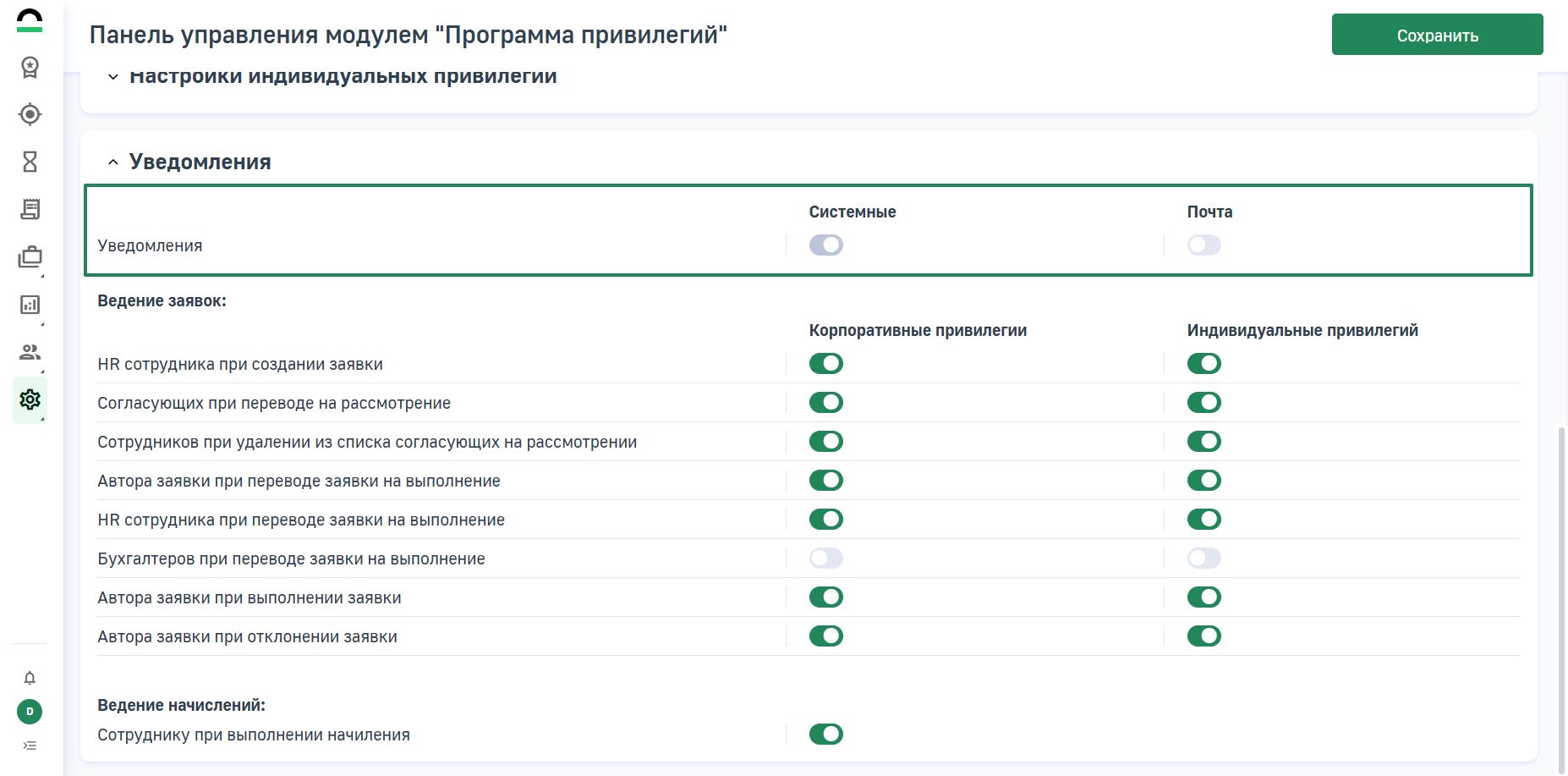 В поле Уведомления вы можете включить необходимые уведомления по ведению заявок и начислений, для этого рядом с нужными переведите переключатель в состояние Включен.