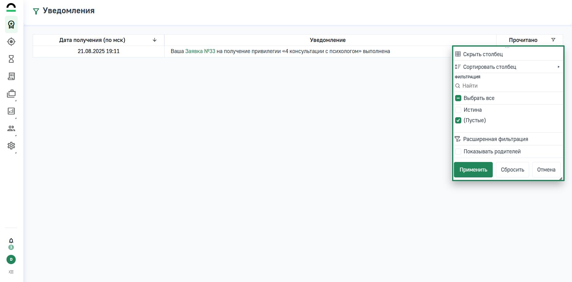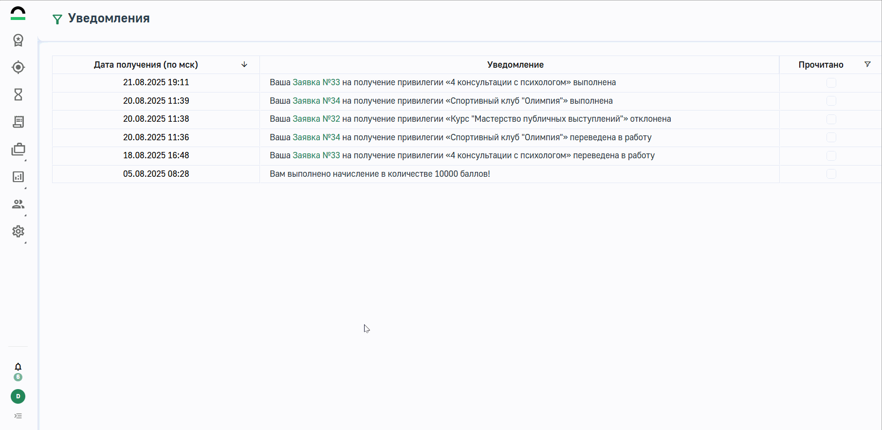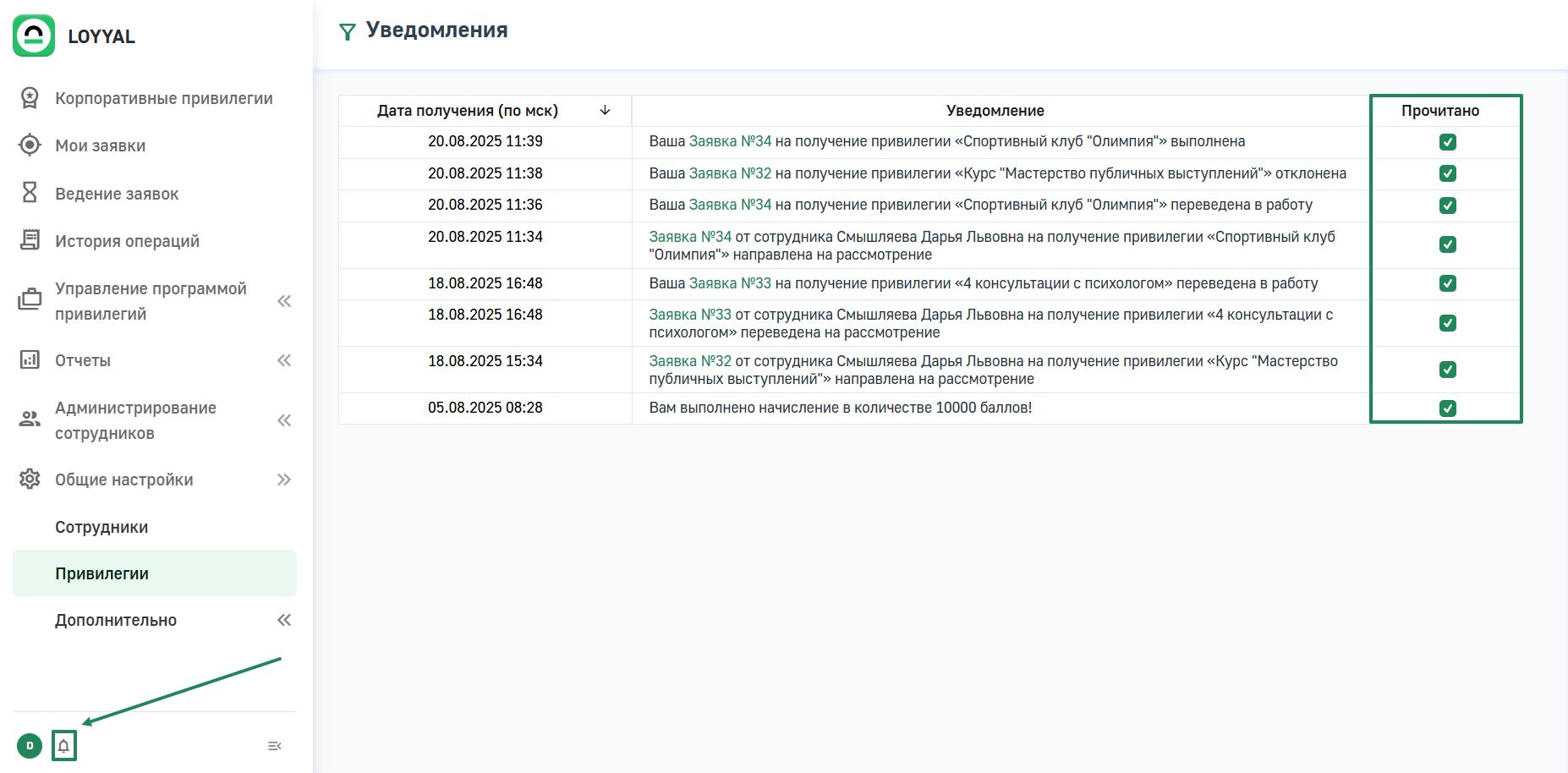 Чтобы посмотреть непрочитанные уведомления, нажмите на кнопку Уведомления в левом меню снизу. Чтобы прочитать уведомление, поставьте рядом с ним