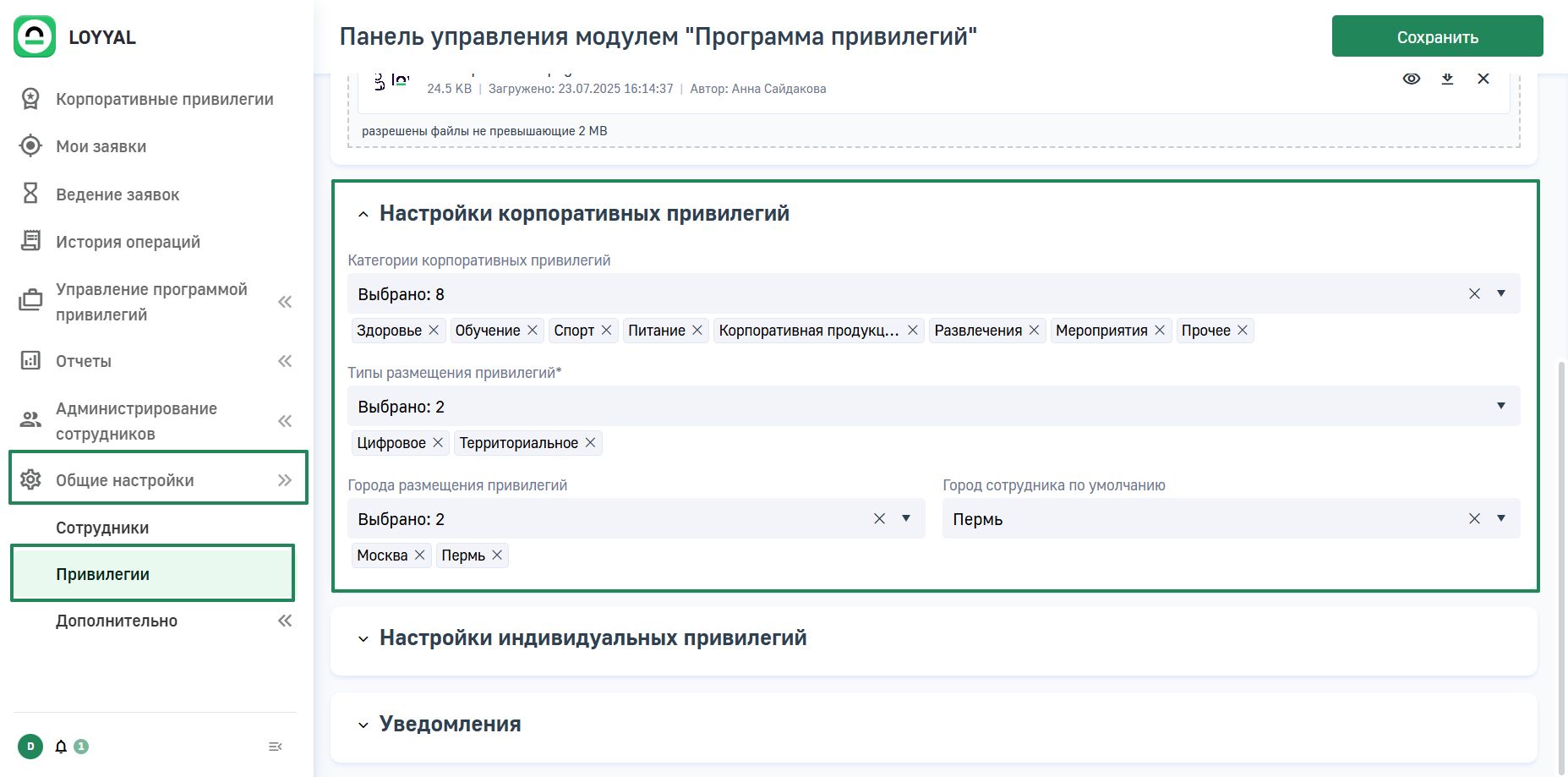 Для настройки корпоративных привилегий перейдите на вкладку меню Общие настройки -> Привилегии.