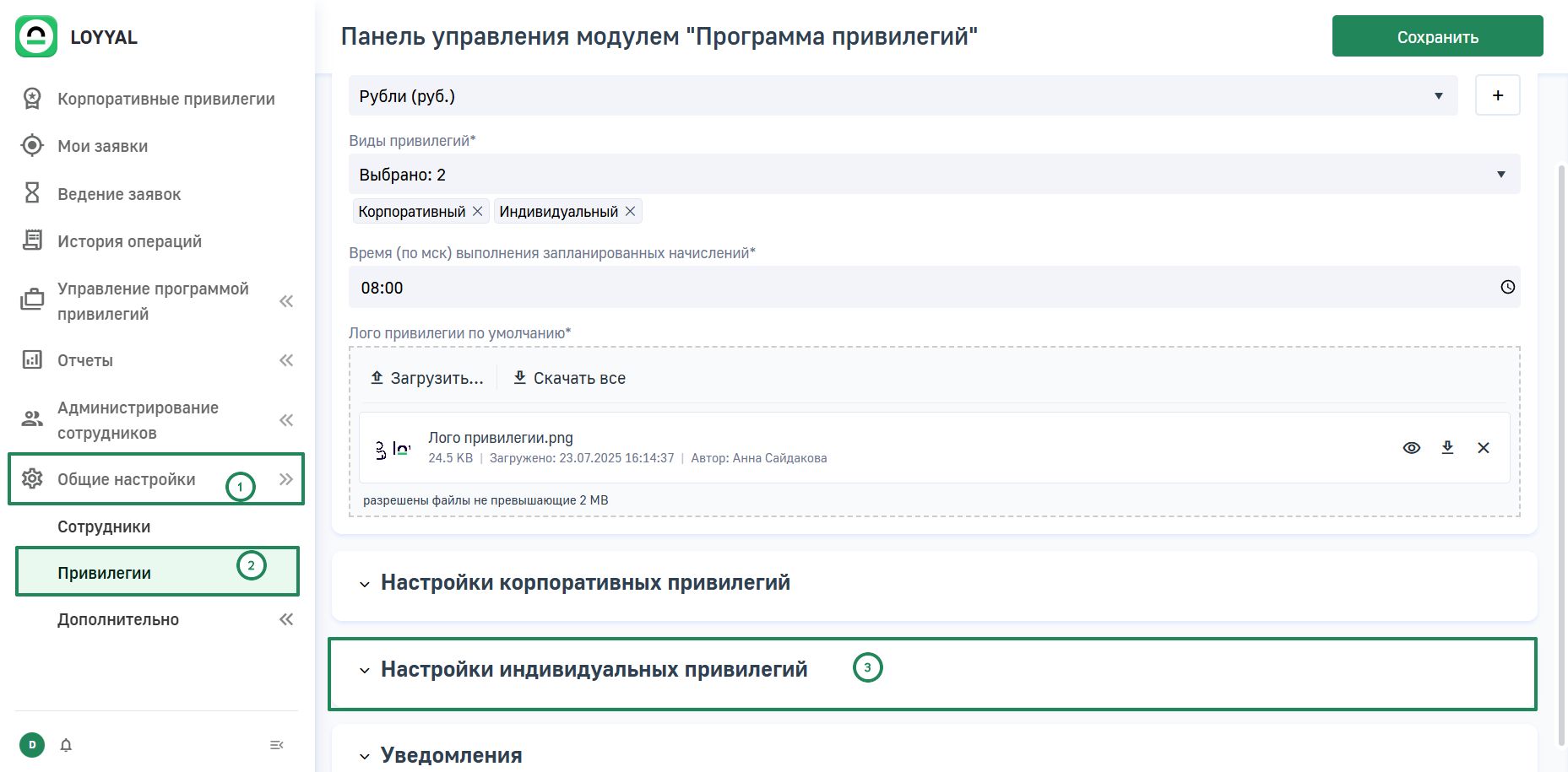 Для настройки индивидуальных привилегий перейдите на вкладку меню Общие настройки -> Привилегии -> Настройки индивидуальных привилегий.