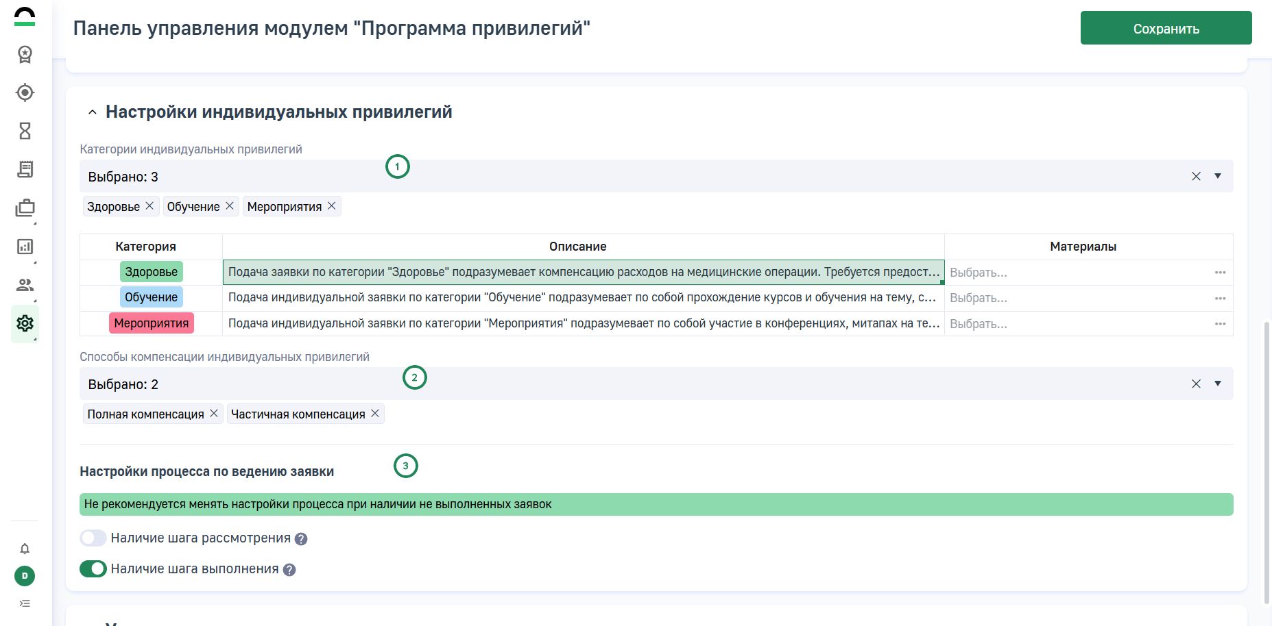 - Категории. Вы можете выбрать категории, по которым можно подать индивидуальные заявки (подробнее о настройке категорий индивидуальных привилегий читайте в статье Категории индивидуальных привилегий).