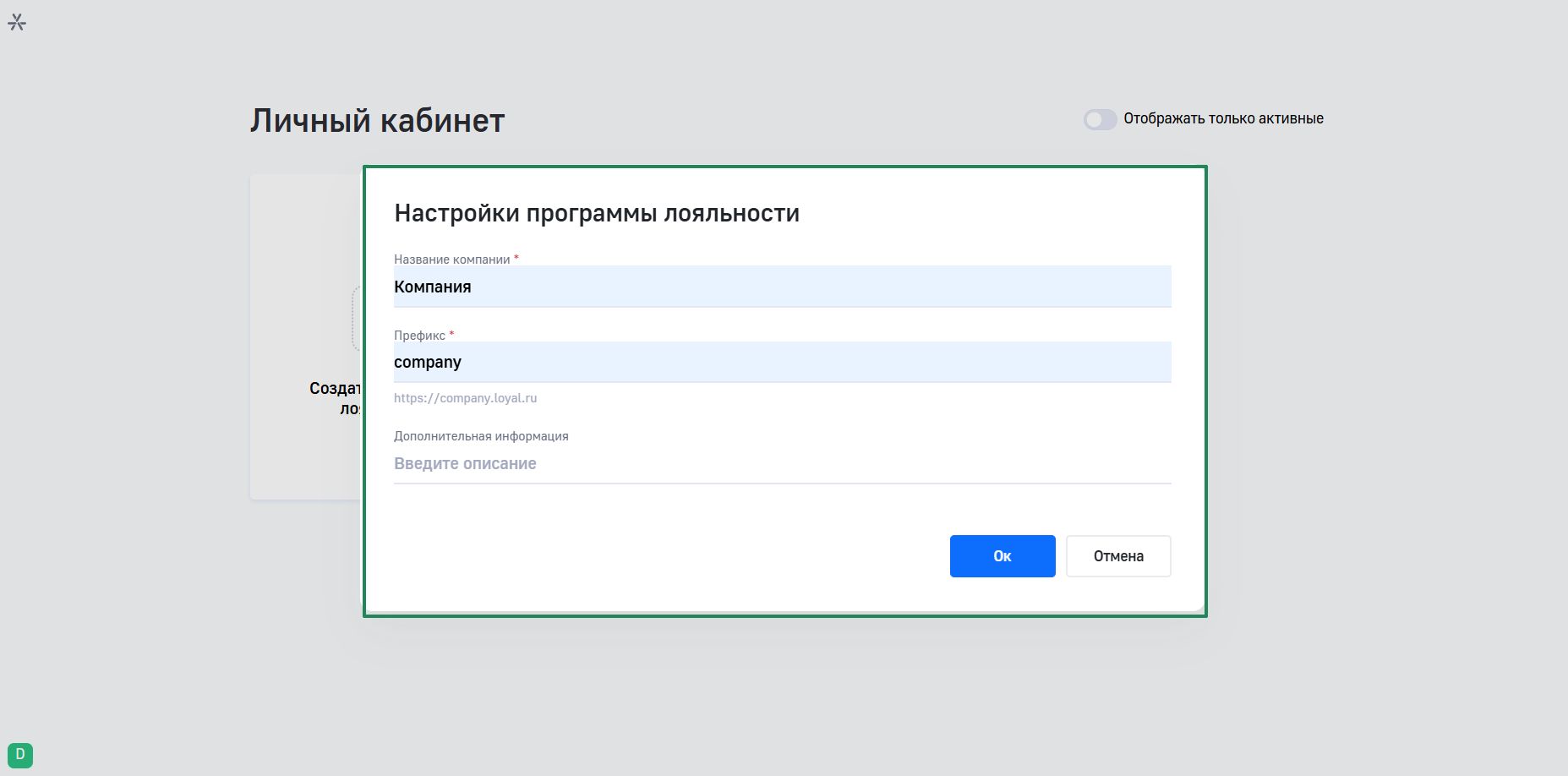 - Нажмите на кнопку Создать программу лояльности, введите название компании, префикс и при желании дополнительную информацию.